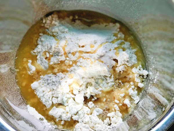 中筋粉中加入低筋粉,加入猪油,用温水调匀。