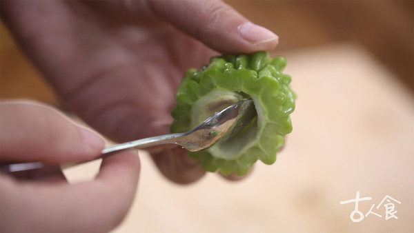 先把苦瓜洗净切成三厘米到四厘米长的小段把当中的籽掏空。