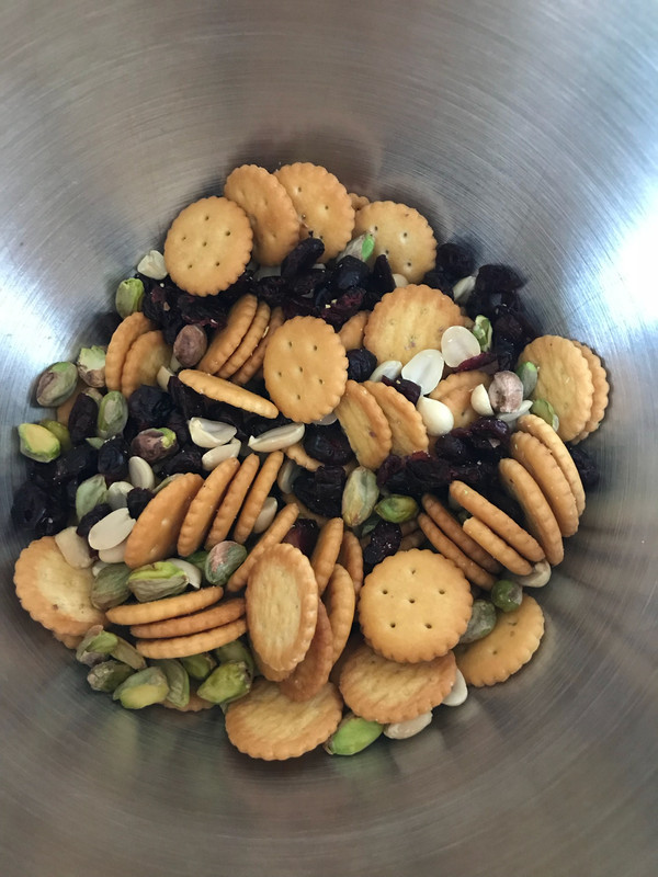 提前工作要做好,奶粉单独放一个容器里备用,把饼干,综合坚果,蔓越莓干混合放一起,因为后面这几种材料是一起倒进锅里的