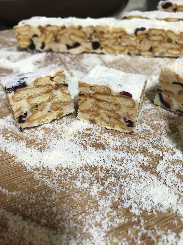 整形尽量快一点,特别是冬天,不然凝固了就很难整,整完后,趁着余温,赶紧用面粉筛筛一层奶粉上去,这就是雪花的效果,可以增加奶香味,更可以防粘
