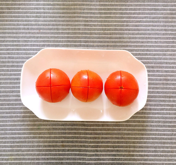 番茄洗净划十字刀,我喜欢划深一点长一点,比较容易去皮。当然,如果你也是懒癌症患者也可以不用去皮。