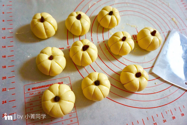 然后用刮面板印出南瓜表面的纹路,顶部轻轻按一下,塞进葡萄干。