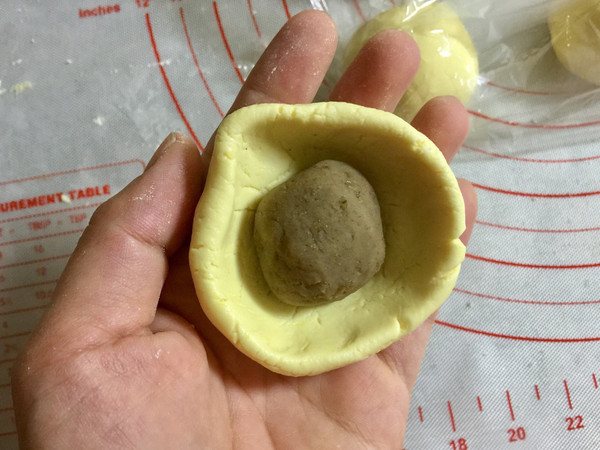 把糯米团在手里按一下,转着边缘捏出碗状,把栗子馅团包进去。
