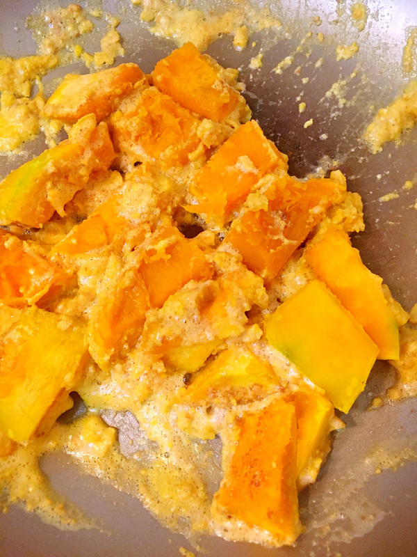转中火轻轻翻炒南瓜,让南瓜充分裹上咸蛋黄后关火