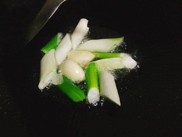 取干净锅热油,油温至6成热时,先放入蒜头和大葱爆香。