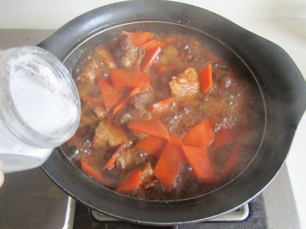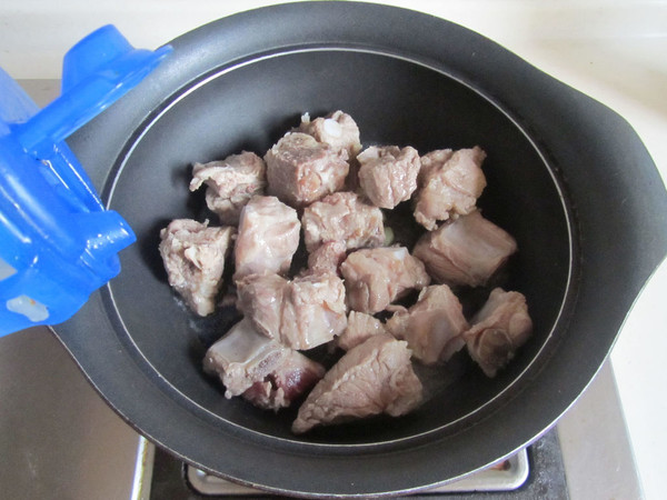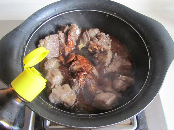 翻炒上色后加入适量的水, 煮开后转为小火加盖炖煮10分钟;