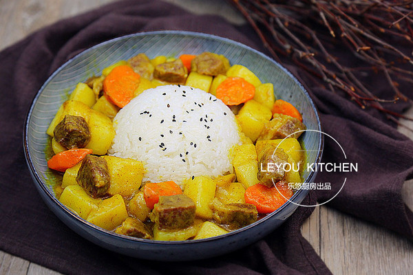 吃的时候,将炖好的咖喱牛肉浇在米饭上就可以啦~