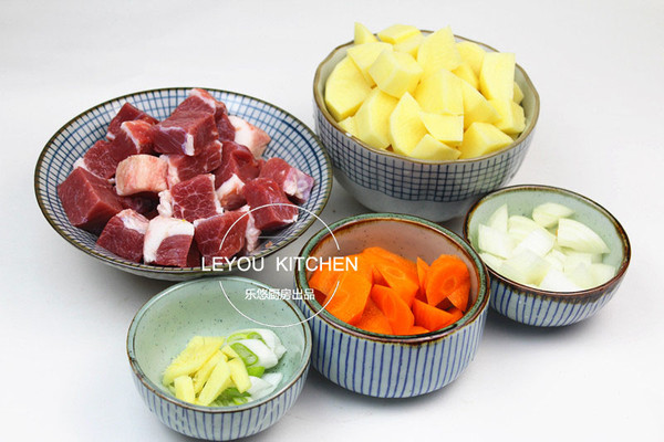 将牛肉切块、土豆切块、胡萝卜切块、洋葱切块、葱姜切末备用。(葱姜也可以不用)
