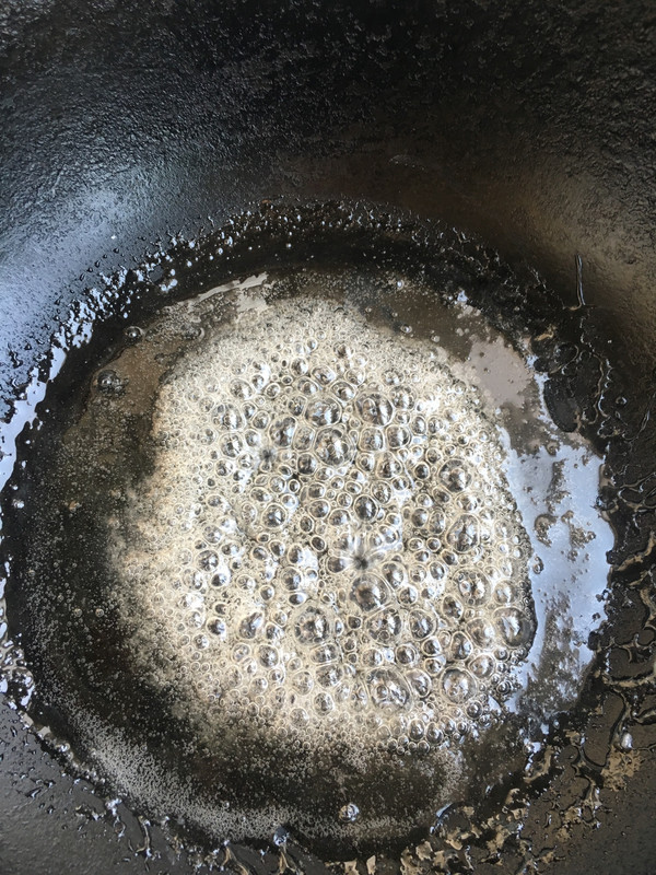 熬至糖融化,冒出大泡,放两滴醋(不腻),继续熬