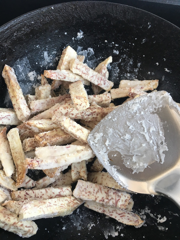 下油后不要用铲子翻,芋头很容易碎,怕粘锅可以时不时的晃一晃锅。炸上个4~5分钟,感觉芋头条表面已经上了一层硬壳了就可以捞出来了。