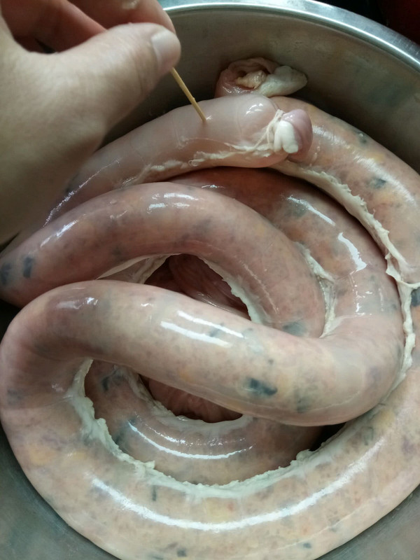如图,灌好后小肠留个三四公分再打结,灌的太饱绑节容易爆开那样得不偿失啊。注意绑节时从中间开始绑,让空气以及肉往两头跑,如果从一端开始绑那样肉会比较松。可以推挤就是,上手了就懂得如何来。绑的节越短越辛苦。绑好后扎眼排气。