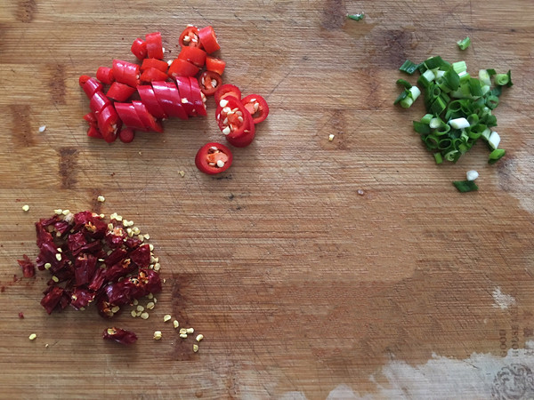 湖南人喜欢辣,我再加了4-5根干红辣椒切段,两个新鲜红辣椒切圈装盘好看,2-3根香葱切碎备用
