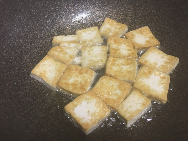 我用刀就在盘子里切好,这样不易碎也方便拿到锅里煎制。豆腐可煎可不煎,煎过表皮更韧且不容易烂,不煎更嫩,均可