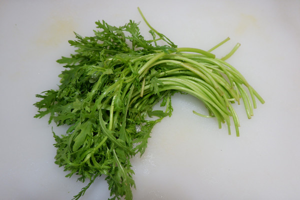 茼蒿洗净,去老根,摘坏叶老叶
