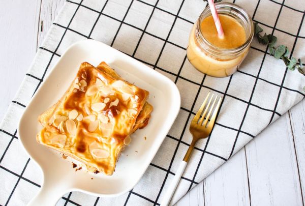 将吐司放在铺有烘焙纸的烤盘上,将做好的芝士溶液均匀淋在吐司上,再放上杏仁片;