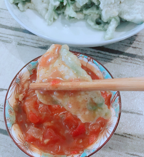 配了两种蘸料,西红柿酱碟,油泼辣子醋蒜碟。
