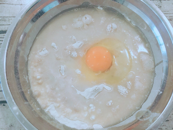 将白面粉,豆面粉,打入一个鸡蛋,分三次温水。用筷子朝一个方向,搅拌至粘稠状。