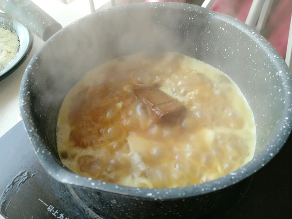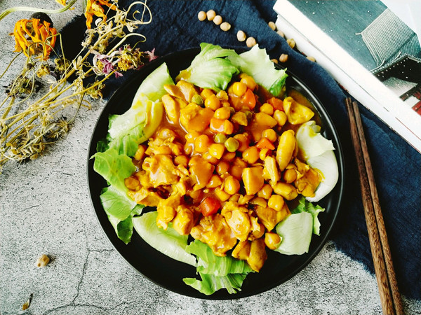 锅内倒入一点食用油,倒入焯好的青豆、胡萝卜、鹰嘴豆翻炒一下 倒入鸡肉翻炒均匀加入适量清水,放入咖喱,中小火煮至汤汁粘稠后,大火稍微收一下汁即可。