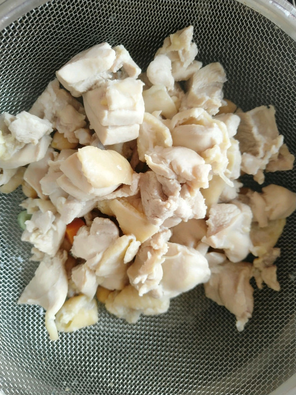锅内烧热水,把腌好后的鸡腿肉倒入锅中焯一下腌好的鸡肉 撇去表面浮沫(这里焯水一是为了去除鸡肉里多余的油脂 二是去除鸡肉里的血渍,如果腌之前焯水的话 鸡肉会紧缩,味道不容易进去 这样可以缩短腌制时间)。