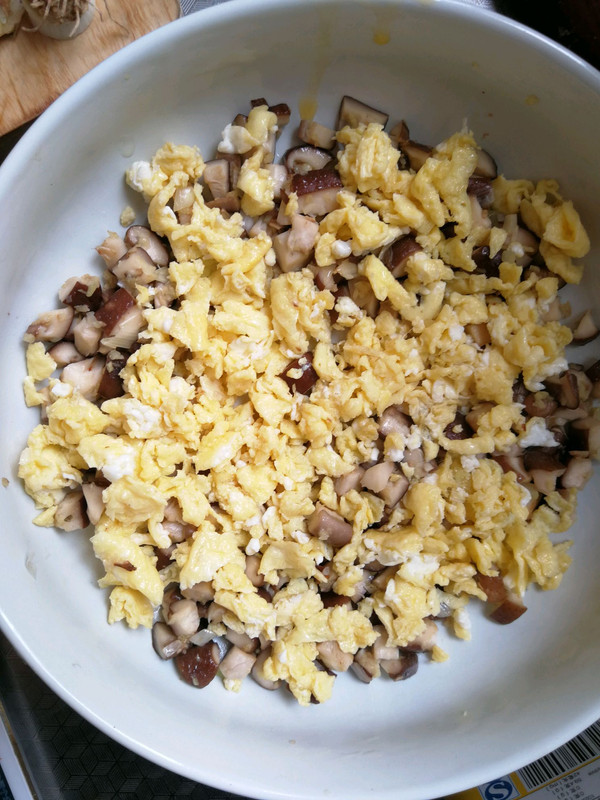 鸡蛋炒散备用。香菇切丁,葱姜切末,锅中放油烧微热,下葱姜炒香后下香菇丁,炒出香菇中的水分,水分基本炒干后出锅和鸡蛋一起放凉备用。