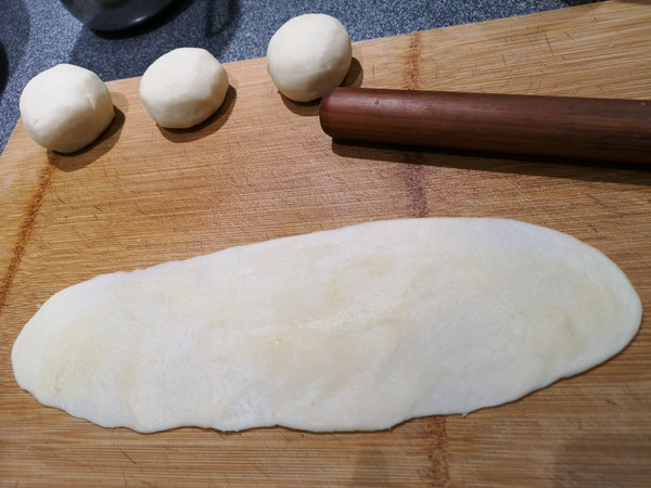 卷好后,将面团立起,用手掌从上往下按平,然后用擀面杖擀成薄饼。