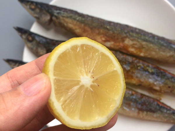 9、吃前现挤一点柠檬汁到秋刀鱼上。