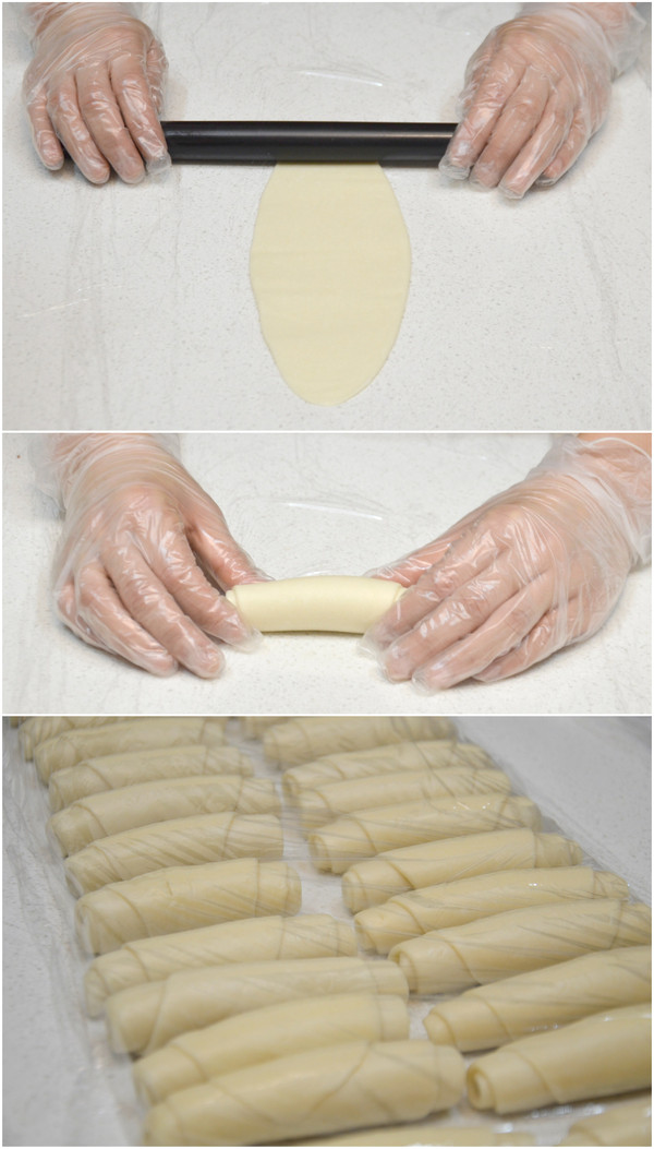 取一份包好的面团收口朝上压扁,擀成牛舌状后由上往下卷起,完成第一次擀卷。