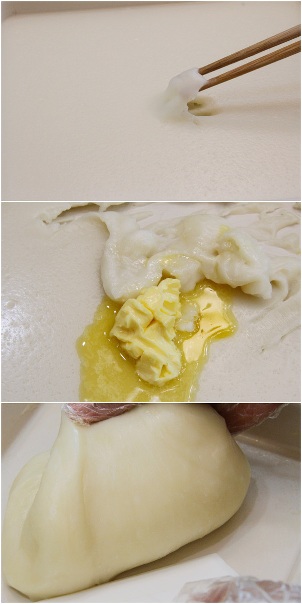 麻薯蒸好后,趁热取出加入黄油,趁着热的时候用工具或者戴手套揉均匀至黄油完全吸收,麻薯团呈光滑的状态。