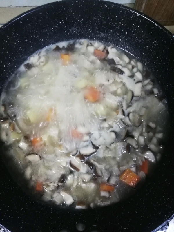 热锅凉油 放入香菇,胡萝卜,土豆翻炒一会