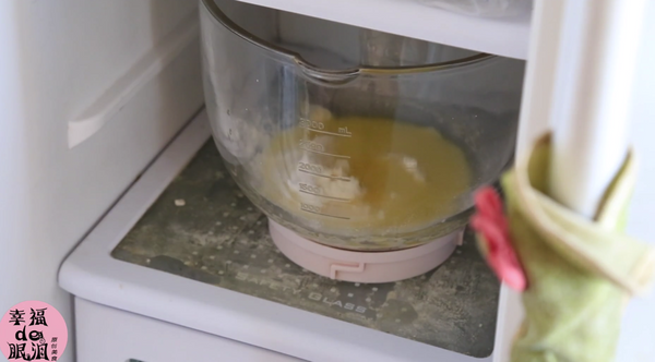 放到烤箱里或者微波炉里进行最后发酵。发酵温度控制在35度,不能超过38度。底下或者旁边放一碗45度左右的热水。时间大概在50分钟左右。根据面团的温度和发酵的温度不同,时间略有不同,最后看状态决定。