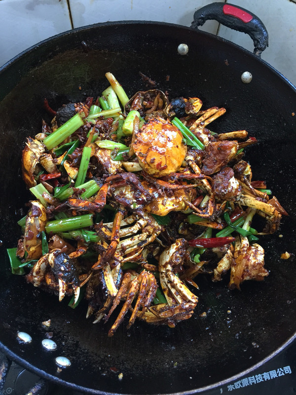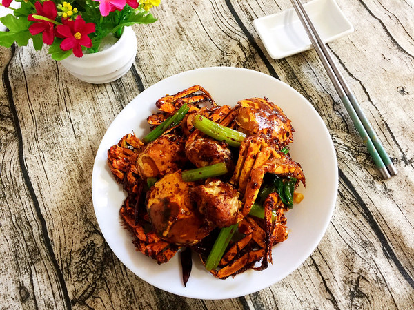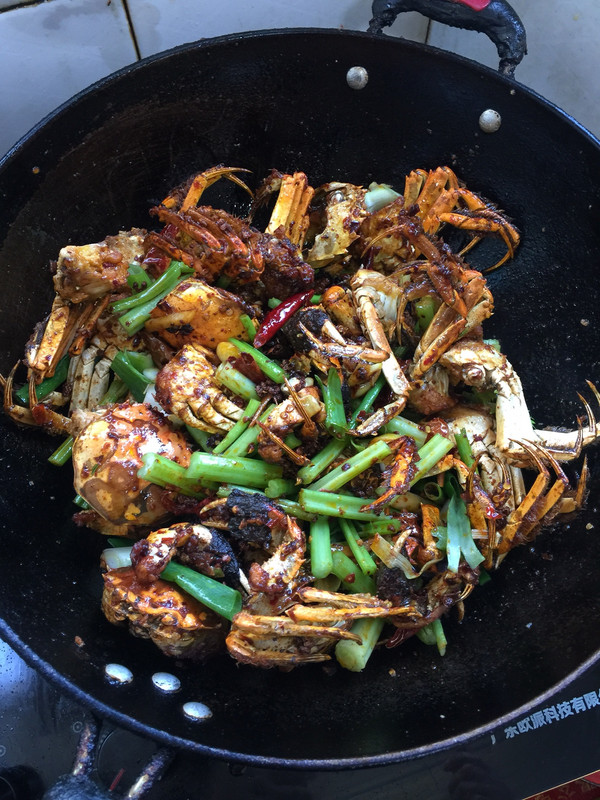 锅烧热倒入适量的油烧至七成热,放入裹好淀粉的大闸蟹炸至金黄稣脆,捞出沥干油分备用。