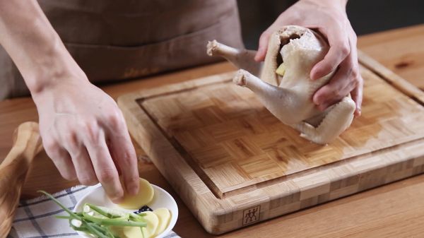清洗整鸡。 用刀或者剪刀去除鸡的头部、屁股以及脚(脚指甲也可以),内脏掏出;用流动的水将鸡血冲洗干净;将鸡放入锅内,倒水,没入鸡身即可;烧沸,捞出放入热水中清洗干净备用。