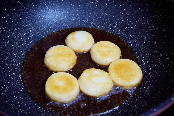 转大火收汁,让每个糍粑都裹上糖浆即可关火盛出食用