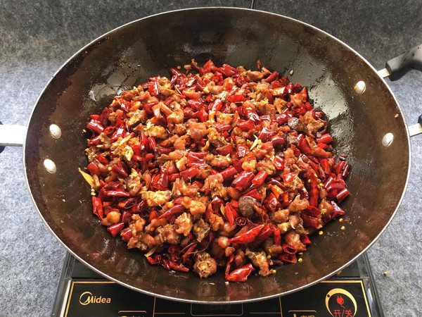 调小火将辣椒和花椒放兔肉中,慢慢翻炒入味,兔肉炒脆一点味道更香!起锅前撒上味精翻炒均匀即可。