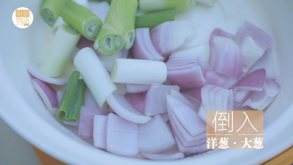 然后我们来做部队锅,准备一些食材,200g洋葱切块、100g大葱切段、5个香菇表面划花、150g金针菇去跟备用。