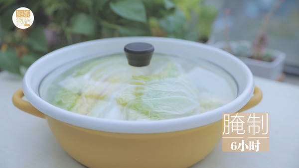 1颗白菜切成4份洗净,每一片叶子均匀的抹上泡菜盐,腌制脱水6小时以上。(觉得盐比较多难融化可以再撒上一点水)