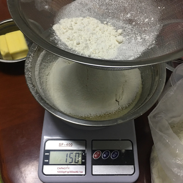 过筛加入低筋粉和泡打粉,搅拌均匀无颗粒