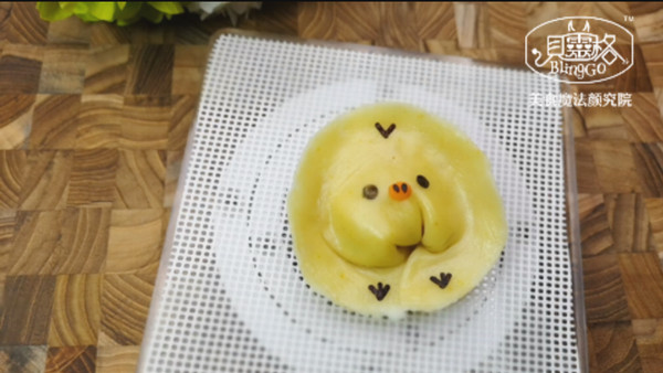 在黄色饺子上完成猪鼻鸡的造型,其中猪鼻鸡的鼻子是用胡萝卜和黑芝麻完成。