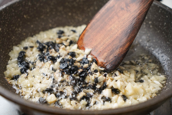 3g豆豉用刀拍扁切碎,5瓣大蒜剁碎,用适量花生油将蒜蓉炒出香气,加入豆豉翻炒几下,盛出备用。