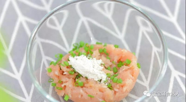 猪肉馅中加入葱末、酱油、鲜菇粉。 *没有鲜菇粉,可以直接加入少量的盐来进行调味儿哈。
