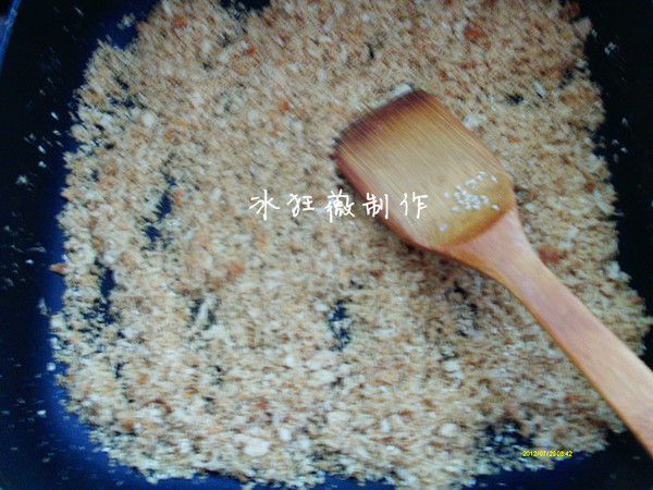 翻炒30分钟左右,鱼肉水分基本收干,按个人口味添加糖粉,没有的也可以用砂糖粉碎,我加的很少,基本吃不出甜味,主要起到一个吊鲜的作用。