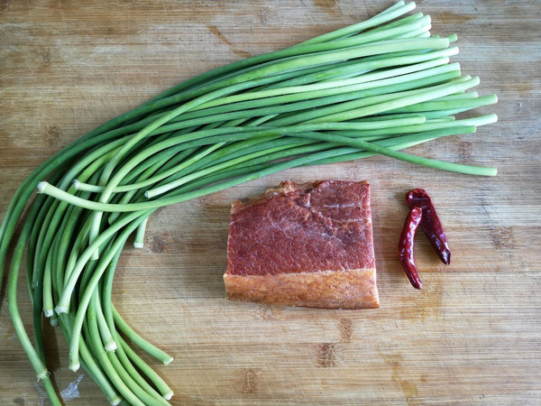 准备食材。蒜苔摘好洗净,腊肉我买的真空包装的那种免洗免蒸的,干辣椒洗净。