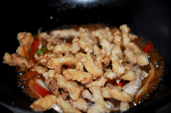 翻炒至鸡胸肉均匀的挂上糖醋汁
