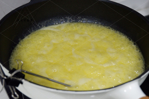 然后转小火不停的搅拌,慢慢的熬煮,锅中的液体会逐渐浓稠,此时是130度的颜色。