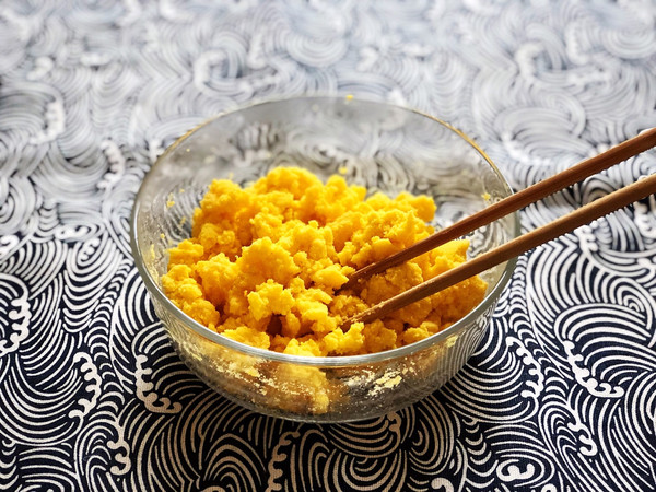 150g玉米面中倒入150g(毫升)沸水,快速搅拌,使玉米面断生,放凉备用。