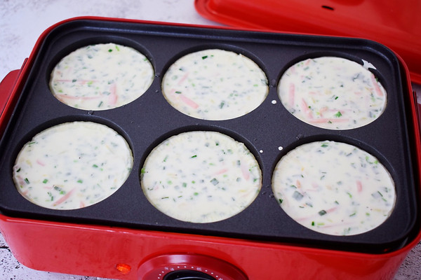 美食锅放入6圆孔多用途烤盘,调节至中温,预热电热锅4分钟后刷一层油