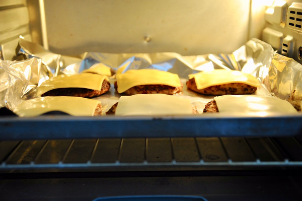 放入烤盘中,芝士片放在肉饼上,入烤箱烤至芝士片融化.大约5分钟.