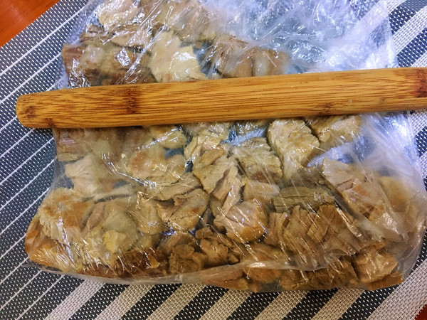放入保鲜袋,用擀面杖把肉敲散。敲散的肉是一丝丝的,如果还有比较大块的用手再撕小点。
