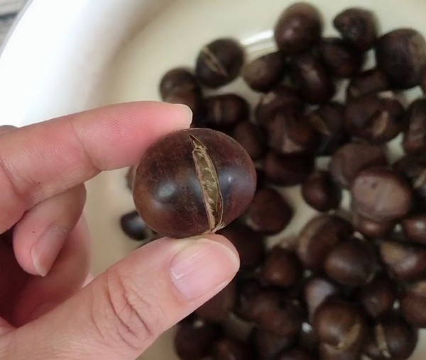 这种做法的糖炒栗子,皮非常容易就拨开了,不需要开口器的