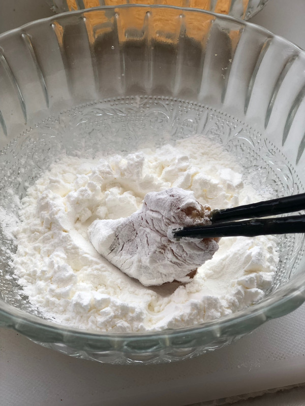 腌好的鸡肉,先裹一层玉米淀粉。